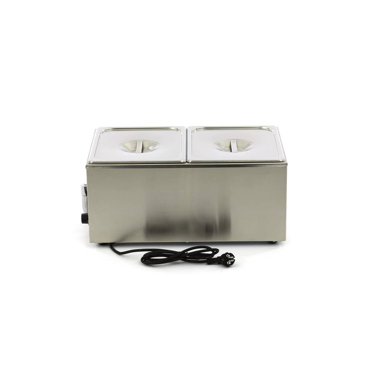 Diese Bain-Marie ist ideal zum Erhitzen von Schokolade, Saucen, Milchprodukten und Mischungen. Dank des schön verarbeiteten Gehäuses und des nahtlosen Innenrands ist diese professionelle Bain-Marie sicher in der Handhabung. Mit dem Ablasshahn lässt sich der Bain-Marie-Behälter leicht entleeren. Der Thermostat hat einen Temperaturbereich zwischen 31 und 95ºC. Die Kontrollleuchten zeigen an, wann das Wasser die richtige Temperatur erreicht hat. Die Bain-Marie kann mit GN-Blechen mit einer maximalen Höhe von 15 cm verwendet werden. Dieses Küchengerät wird mit 2 x 1/2 GN-Behältern und Deckeln (15 cm) geliefert.