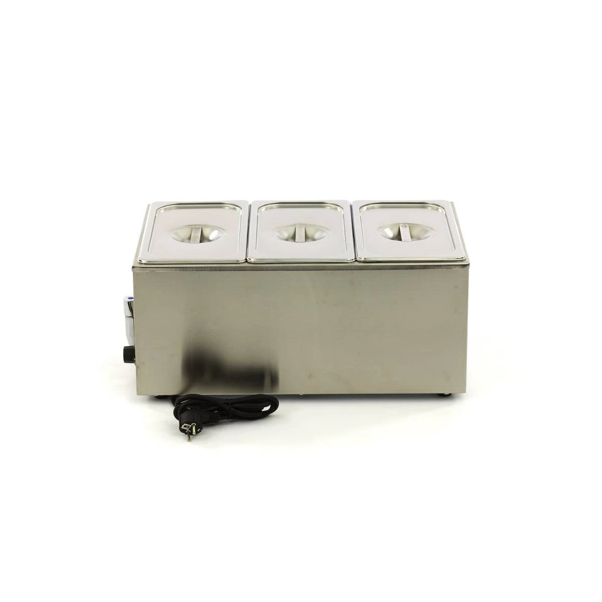 Diese Bain-Marie ist ideal zum Erhitzen von Schokolade, Saucen, Milchprodukten und Mischungen. Dank des schön verarbeiteten Gehäuses und des nahtlosen Innenrands ist diese professionelle Bain-Marie sicher in der Handhabung. Mit dem Ablasshahn lässt sich der Bain-Marie-Behälter leicht entleeren. Der Thermostat hat einen Temperaturbereich zwischen 31 und 95ºC. Die Kontrollleuchten zeigen an, wann das Wasser die richtige Temperatur erreicht hat. Die Bain-Marie kann mit GN-Blechen mit einer maximalen Höhe von 15 cm verwendet werden. Dieses Küchengerät wird mit 3 x 1/3 GN-Behältern und Deckeln (15 cm) geliefert.