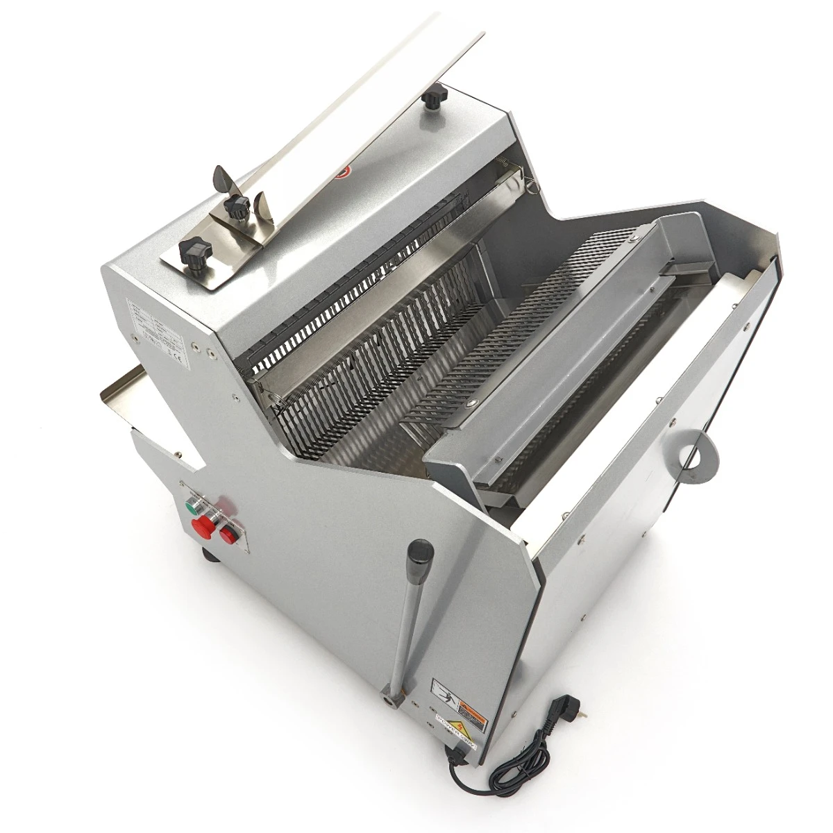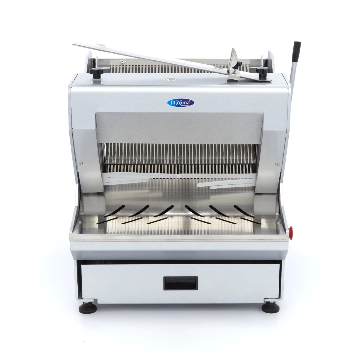 Diese Brotschneidemaschine aus beschichtetem Stahl ist ein langlebiges Gerät und eignet sich zum Schneiden verschiedener Brotsorten. Unsere Brotschneidemaschinen sind mit verschiedenen Brotstärken erhältlich. Diese Maschine hat gezackte Edelstahlklingen mit einem Abstand von 12 mm.