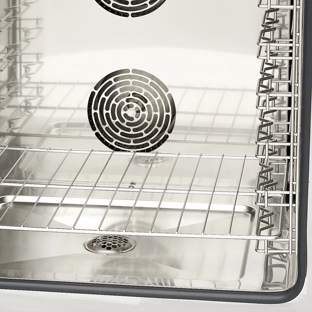 Bevor Sie einen Kombidämpfer reinigen, müssen Sie sicherstellen, dass er vollständig abgekühlt ist. Das Gehäuse, die Tür und der Innenraum sind aus rostfreiem Stahl gefertigt und haben abgerundete Ecken. Das macht die Reinigung sehr einfach. Mit einem weichen Tuch, warmem Wasser und einem milden Reinigungsmittel lassen sich die glatten Oberflächen schnell und gründlich abwischen. Für die Reinigung des Türglases benötigen Sie nur warmes Wasser.