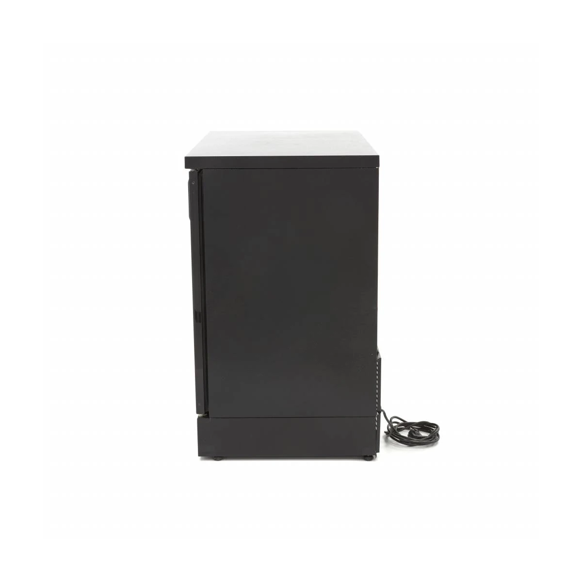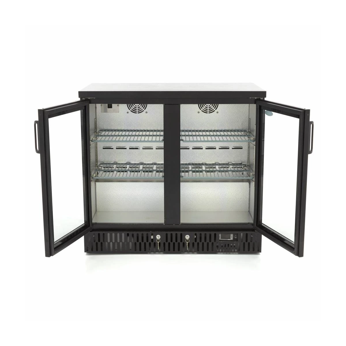 Um Getränke und Snacks professionell zu präsentieren und gleichzeitig gekühlt zu halten, brauchen Sie diesen luxuriös verarbeiteten, schwarzen Getränkekühlschrank. Er hat die ideale Größe für die Aufstellung auf der Bar oder der Theke. Dieses Modell hat ein Fassungsvermögen von 214 l und ist mit zwei Flügeltüren mit Doppelverglasung ausgestattet. Beide Türen sind mit einem Schloss versehen, um den Kühlschrank vollständig zu schließen. Damit die Produkte im Getränkekühlschrank noch besser zur Geltung kommen, ist er mit einer LED-Beleuchtung ausgestattet.