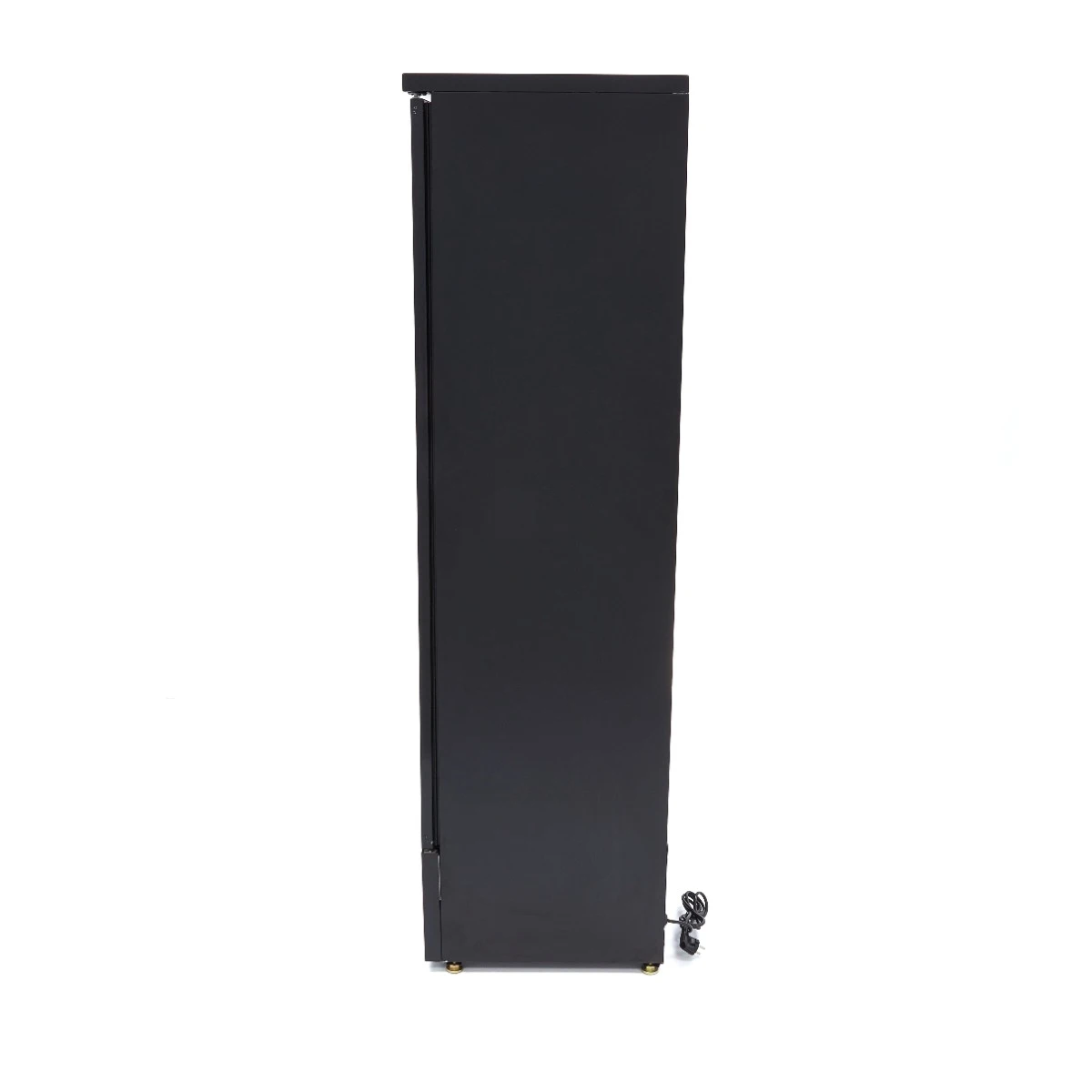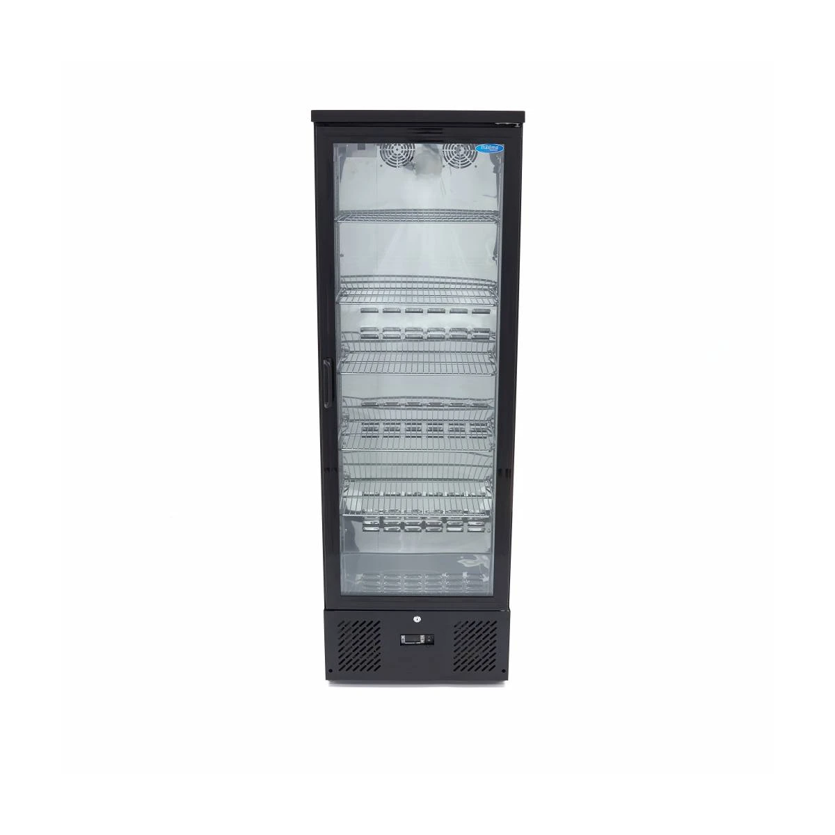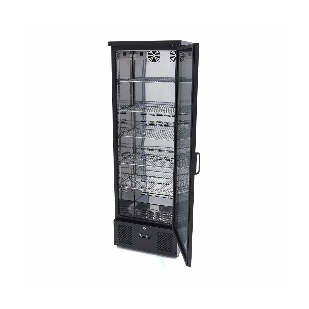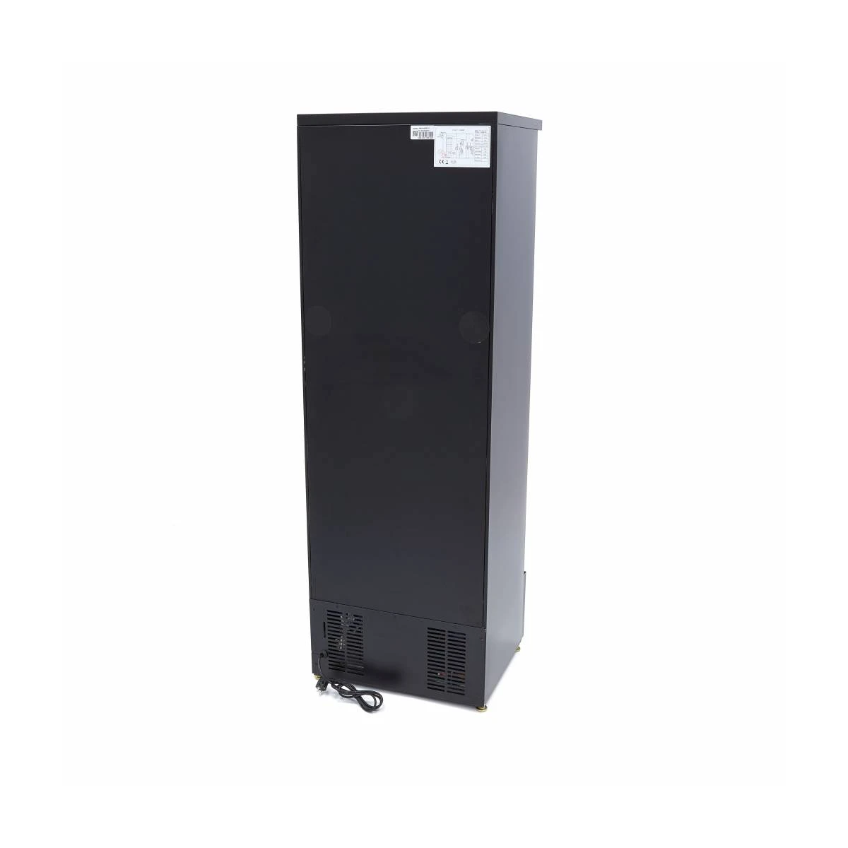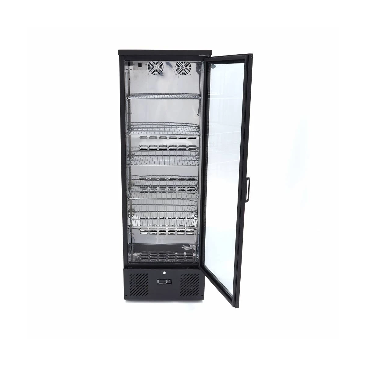 Dieser elegante schwarze Getränkekühlschrank ist ideal für Gastronomiebetriebe mit wenig Platz. Es handelt sich um ein hohes Modell mit einer einzigen Flügeltür, die es Ihnen ermöglicht, viele Produkte vertikal zu lagern, wodurch Sie wertvollen Platz sparen und gleichzeitig alles perfekt gekühlt aufbewahren können, bis es gebraucht wird. Dank der eingebauten LED-Beleuchtung werden die gekühlten Produkte den potenziellen Kunden attraktiv und professionell präsentiert. Die Tür ist mit einem Schloss und zwei Schlüsseln versehen, um sie sicher zu halten, und da der Kühlschrank auf Rädern steht, lässt er sich leicht bewegen. Im Inneren befinden sich fünf Ablagen aus Edelstahl, die jeweils in der Höhe verstellt werden können, um eine optimale Anordnung zu ermöglichen.