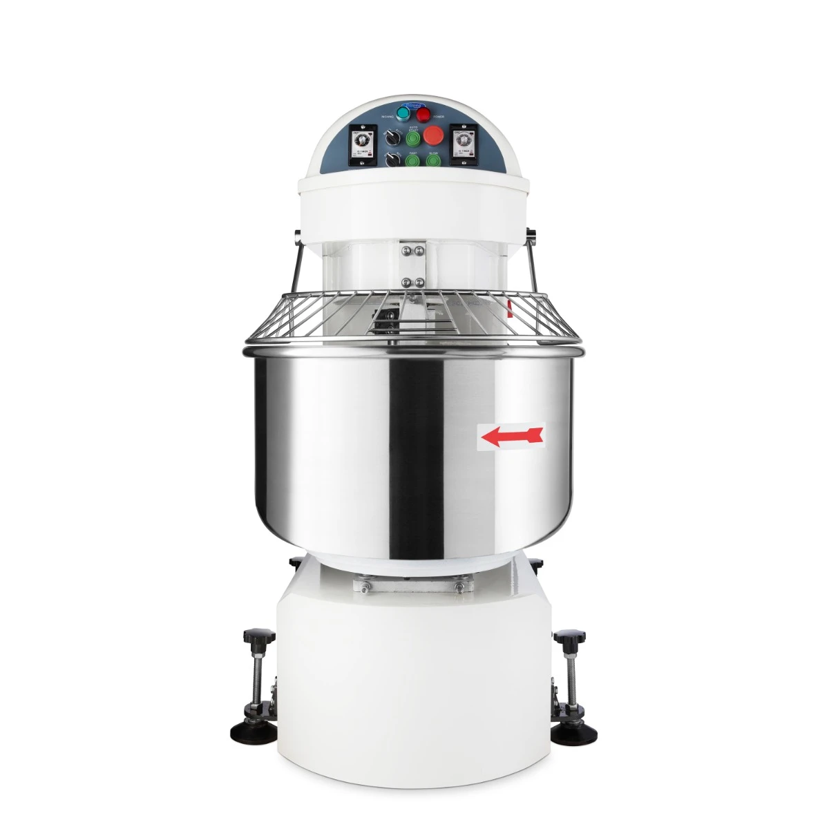 Dieser professionelle Teigkneter kann für schwere Knetarbeiten verwendet werden. Die große Rührschüssel eignet sich zum Mischen von bis zu 50 kg Mehl. Da sich sowohl der Knethaken als auch die Rührschüssel um die eigene Achse drehen, knetet dieser Kneter alle Zutaten zu einem weichen, glatten Teig. Sie können maximal 80 kg Teig und minimal 30 kg kneten. Der Motor ist sehr leistungsstark, aber leise, so dass er in der Küche keinen Lärm verursacht.