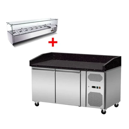 Pizza Kühltisch, Granit rosa-grau, 2 Türen, 151 x 80 Kühlaufsatz GN1/4 mit Glas
