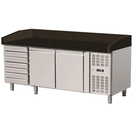 Pizza Kühltisch, Granit Star Galaxy schwarz, 2 Türen 7 ungek. Schubladen, 203×80