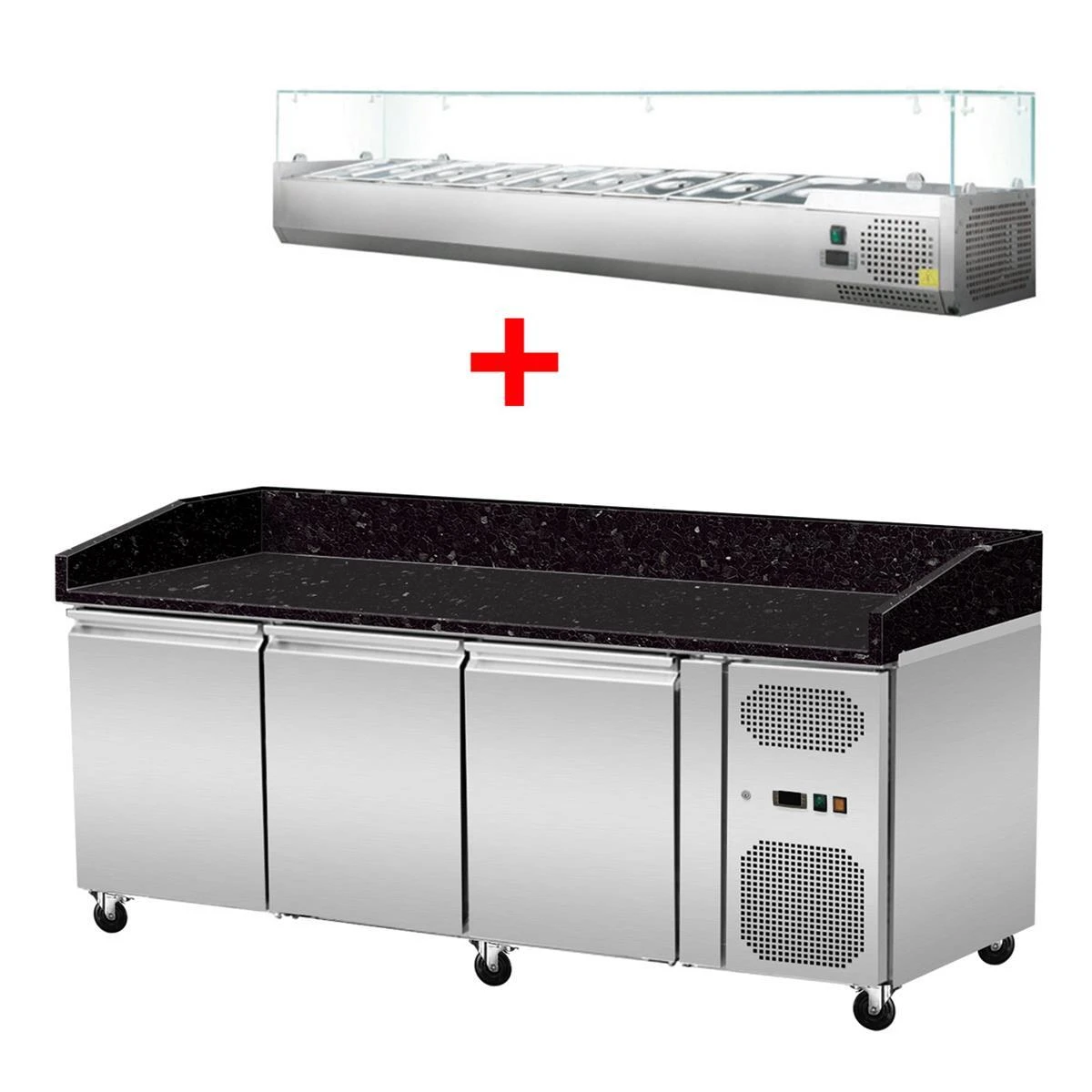 Pizza Kühltisch, Granit Star Galaxy schwarz, 3 Türen, 203 x 80 Kühlaufsatz GN1/4 mit Glas
