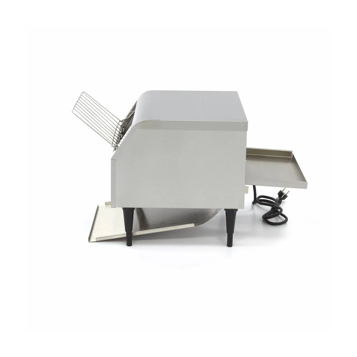 Dieser Durchlauftoaster ist ein professionelles Gerät mit einem eleganten Design und einer hohen Kapazität. Er kann bis zu 450 Scheiben Brot pro Stunde toasten. Er eignet sich auch hervorragend zum Toasten von Pistolenköpfen und Brötchen. Das Brot läuft auf einem Förderband durch den Toaster und kommt unten getoastet wieder heraus.